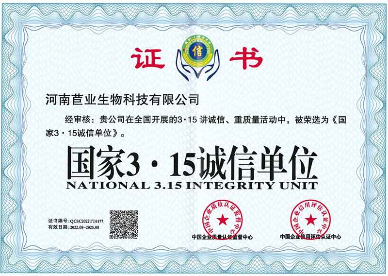 国家3.15诚信单位证书